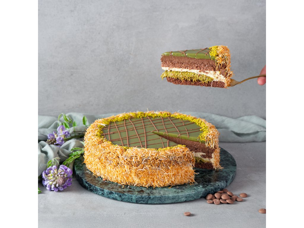 Kompozice: kakaový korpus, pistáciová pasta s KADAIF nudlemi, pistáciový mousse, kakaový korpus, čokoládový mousse, pistáciová poleva, politý mléčnou čokoládou a posypaný kousky pistácií. Na bocích jsou nudle KADAIF.