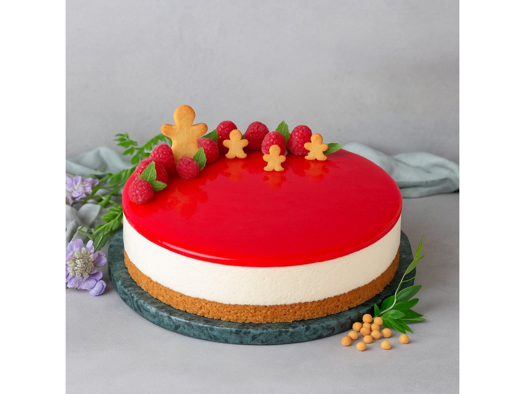 Kompozice: čokoládový korpus, perníkový mousse, malinové coulis, malinová zrcadlová poleva.