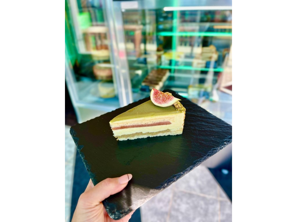 Kompozice: vanilkový korpus, křupavá pistáciová vrstva, pistáciový mousse, fíkové coulis, vanilkový korpus, pistáciová poleva.