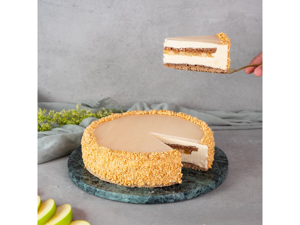 Skořicový korpus, jablka v želé a slaný arašídový mousse. Je ozdoben glazé se zlatým prachem. Vanilkovým krémem a obalen v kouscích arašídů a pufované rýži.