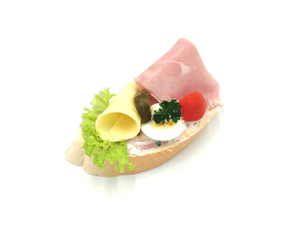 Veka, pařížský salát, šunka, vejce, okurka, gouda, petrželka, biondo salát, rajče, majonéza, pomazánkové máslo.